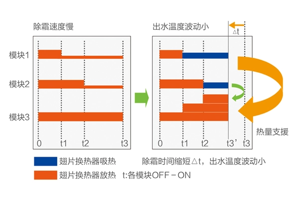 智能除霜技术 海尔R410a风冷模块机组在不同的外界状态下,根据相应的除霜准则判断除霜,避免不必要的能量损失。 在模块机组盘管温度传感器判断除霜时间的基础上,增加压力传感控制器,综合除霜时间、温度和换热器压力三个方面的参数除霜,准确把握除霜时机,当机组运行一段时间,检测到室外盘管温度低于一定值,机组进入除霜模式,除霜过程中室外盘管温度高于一定值或持续除霜12min时,机组结束除霜,向为出完霜的模块,转移热量,缩短除霜时间,保证舒适性 ![]()